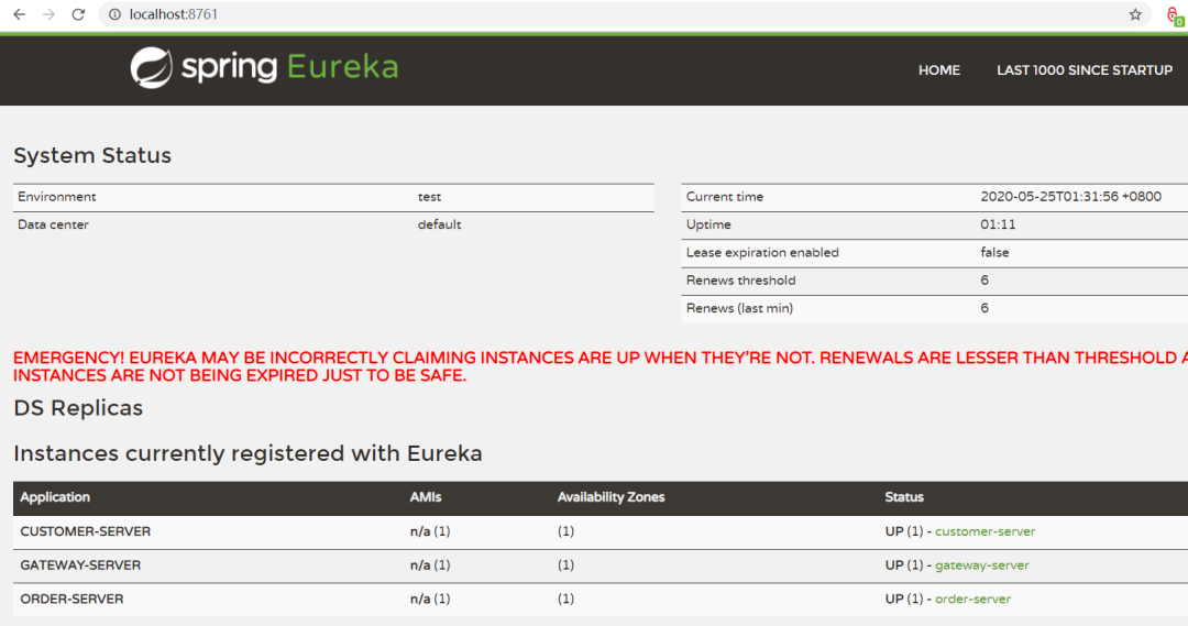 然后启动服务测试,按顺序启动,依次启动eureka-server、customer-service、order-service、gateway-service。然后登录eureka客户端。