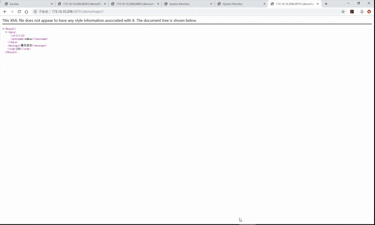 多次调用 http://192.16.10.208:38701/demoFeign/1 进行测试,可以发现运行在38201和38202的demo-service服务交替打印信息