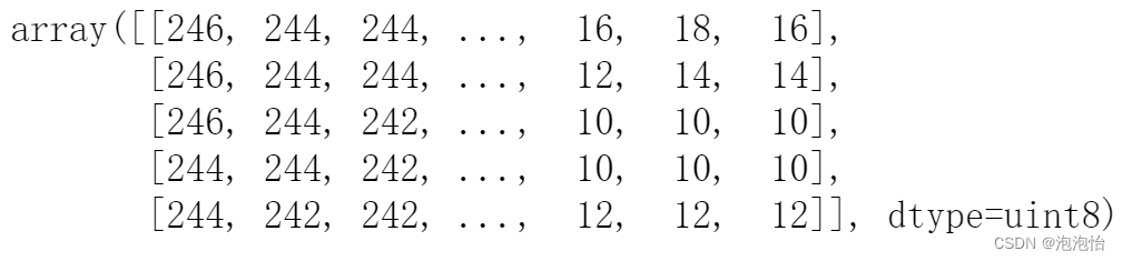 array([[ 98, 97, 97, ..., 111, 112, 111], [ 98, 97, 97, ..., 109, 110, 110], [ 98, 97, 96, ..., 108, 108, 108], [ 97, 97, 96, ..., 108, 108, 108], [ 97, 96, 96, ..., 109, 109, 109]], dtype=uint8)