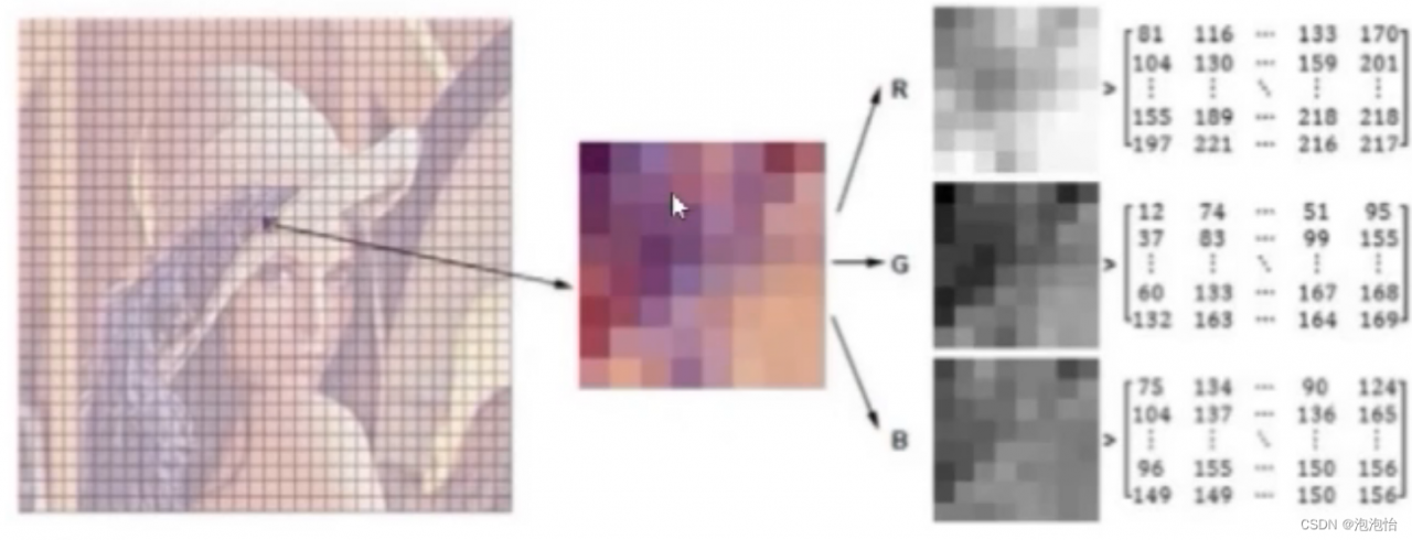 首先拿来一张图片分割成无数个小格,每一个小格叫做像素点,计算机中的图像是由像素点构成的像素矩阵,像素点构成它的每一个值都是在0-255之间浮动的,表示亮度。当取值为零的时候就是黑色,取255超级亮了可以视为白色。R,G,B是颜色通道,彩色图像有三个颜色通道,灰度图像只有一个颜色通道。