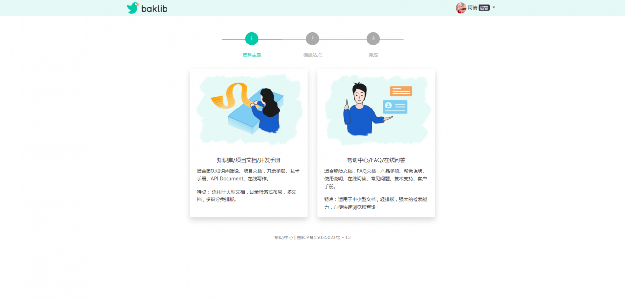 使用Baklib,十分钟就能搭建起一个帮助中心界面,零试错成本,直接进入官网,注册账号,新建站点(帮助中心),选择“帮助中心/FAQ/在线问答”。