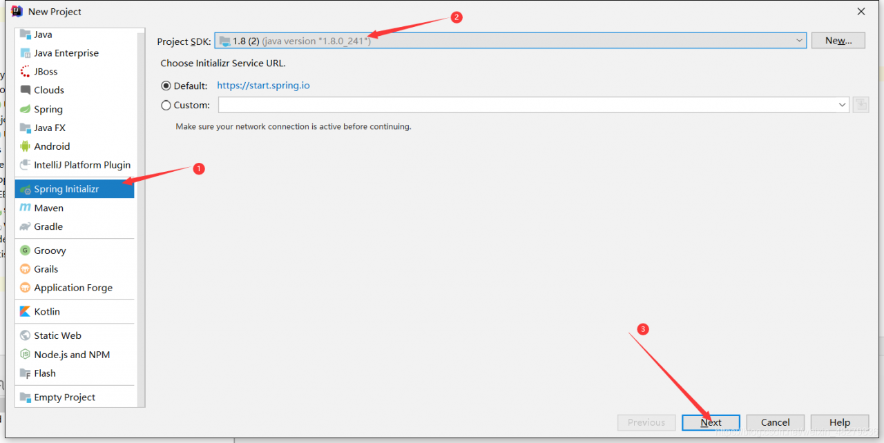 - 接下来选择Spring Initializr项目,选择jdk版本,本文选择使用jdk1.8,然后点击next。如下图: