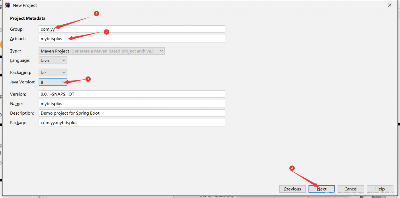 - 然后更改自己的包名(Group),以及项目名(Artifact),这里Java Version选择8,然后点击Next。效果图如下: