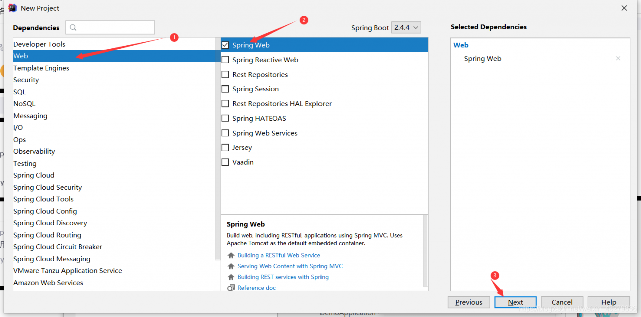 - 接下来选择Web项目,以及选择Spring Web框架载入,然后Next。效果图如下: