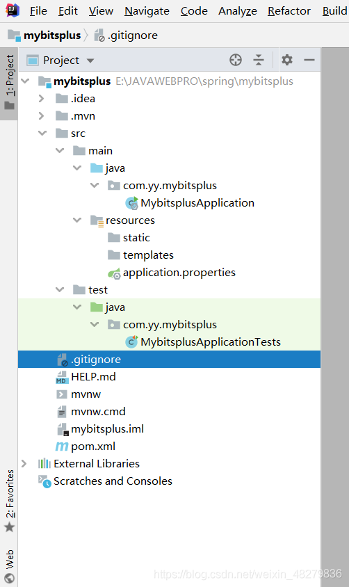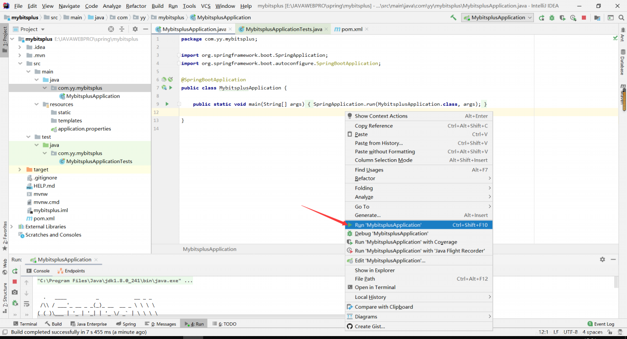 - 接下来找到MybitsplusApplication文件(这里发现mybatis单词拼错了,大家在接下来的时候要注意点),右键运行main方法测试一下是否配置成功,如果配置成功如下图: