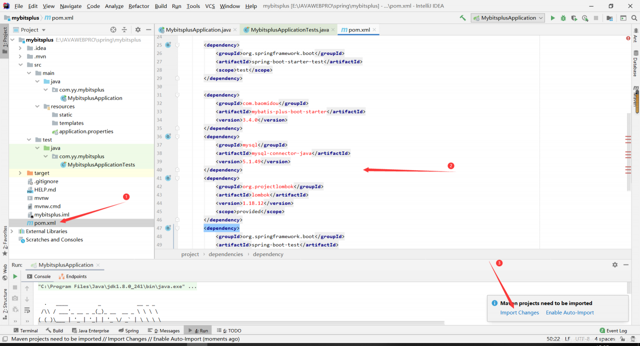 - 找到pom.xml,引入相关依赖,然后点击Import Change等待配置,这就得看你的网速了,金钱的力量!!