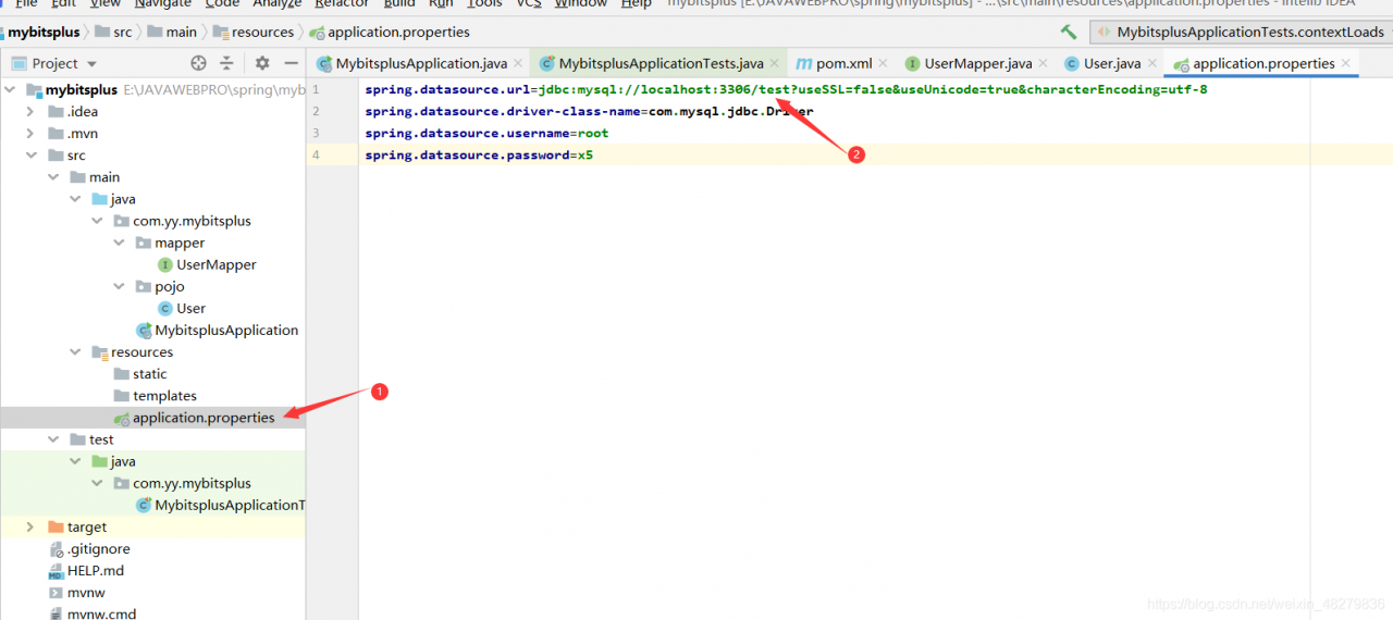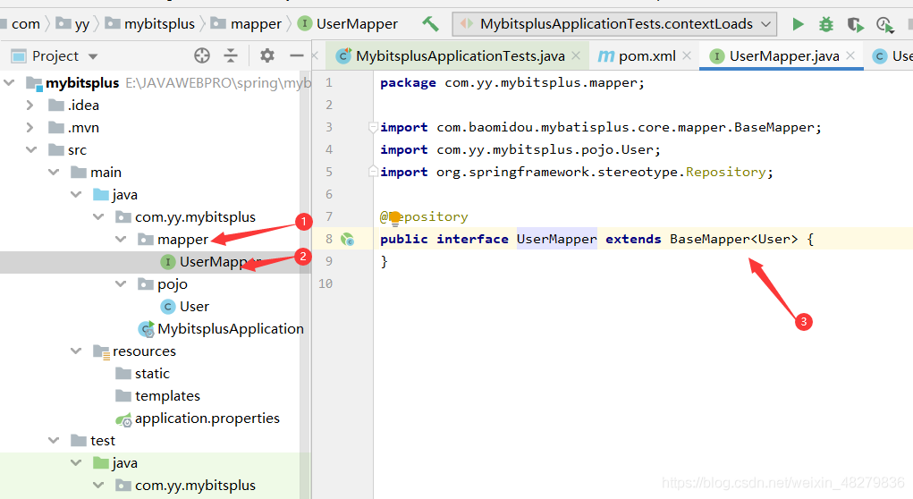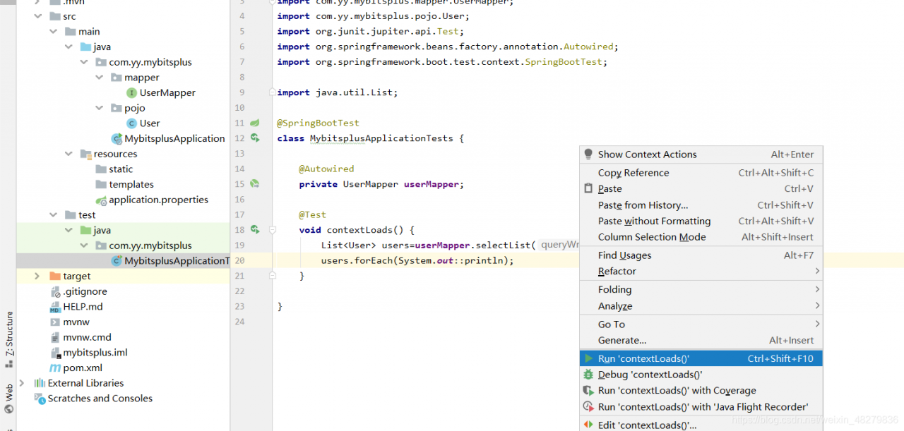 - 接下来我们进行测试,打开test文件夹写的MybitsplusApplicationTests测试类,编写代码进行测试,要引入UserMapper接口注意,如下图所示: