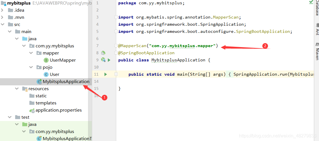 - 接下来在MybitsplusApplication文件中引入Mapper接口,如下图所示: