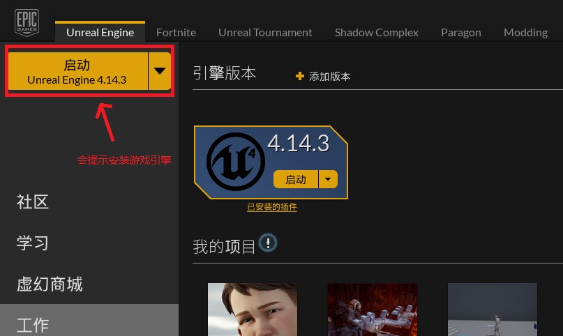 我这里安装好了,所以直接点击就可以打开游戏引擎。如果没有安装,黄色区域会提示你安装游戏引擎,接下来就跟普通的电脑软件安装差不多了,根据自己的需要安装引擎的主体和插件。不知道自己需要什么东西,一直选择默认就可以了。