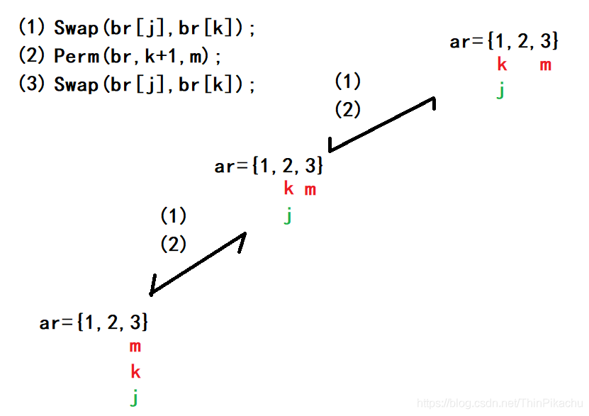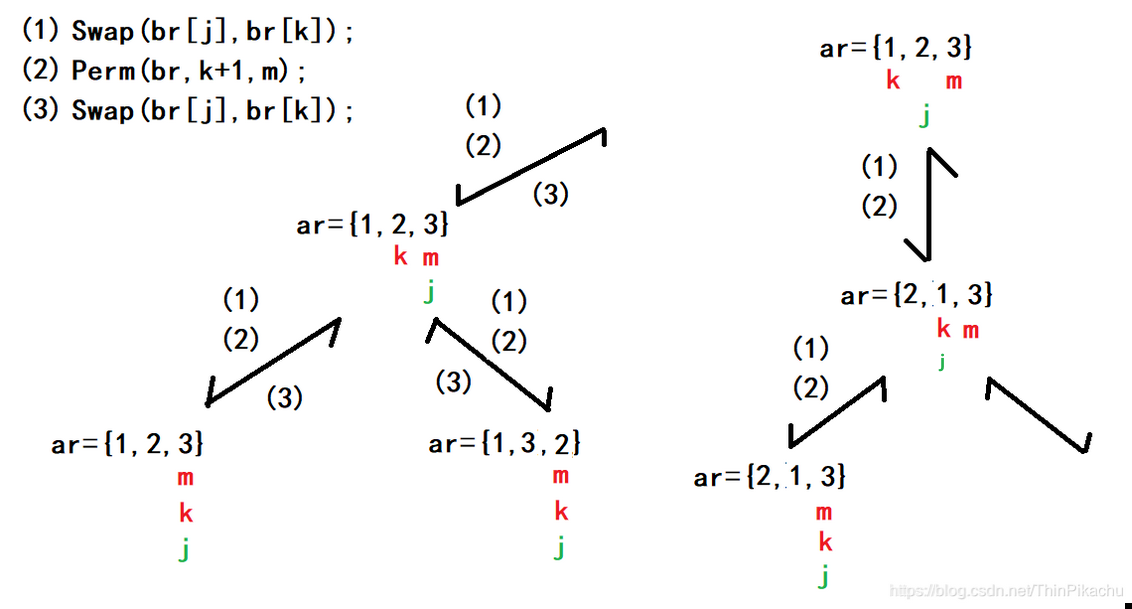 此时第一个Perm函数中 ar 的 j进行++操作,接着在执行(1)(2),调用了一个新的Perm函数,且此时 ar数组 k位置和j位置的数互换。此时 ar = {2,1,3}。进入Perm函数后,k !=m,进入for循环,将 k的值赋给 j。接着在执行(1)(2)。