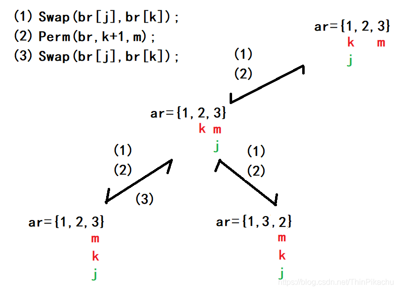 执行完(1)(2)后ar = {2,1,3},且此时 k == m,所以执行打印语句,即此时全排列的第三个数据为 2,1,3。