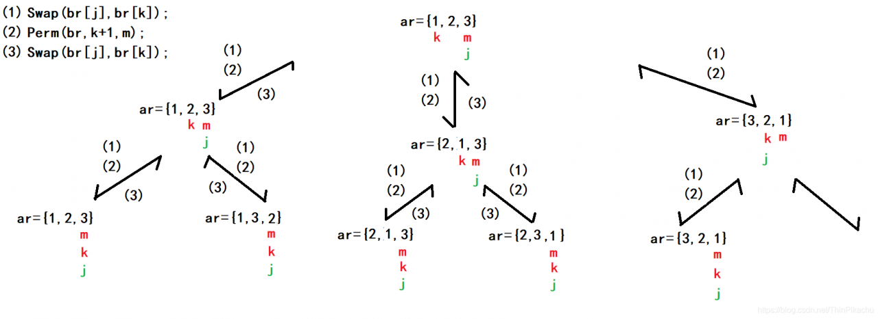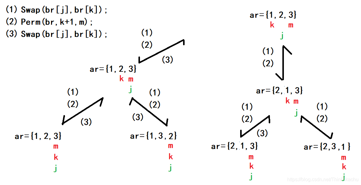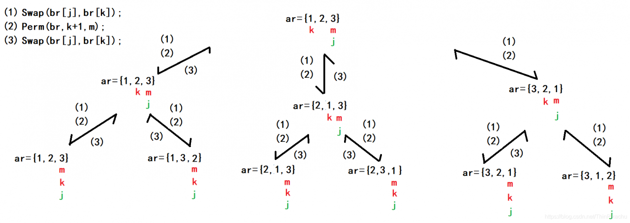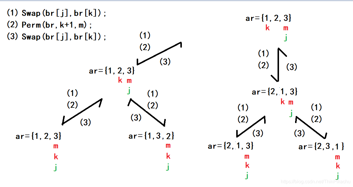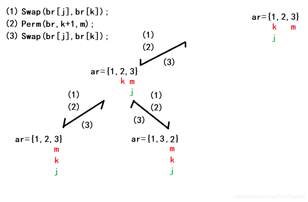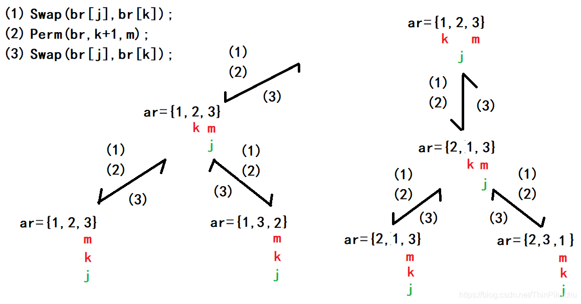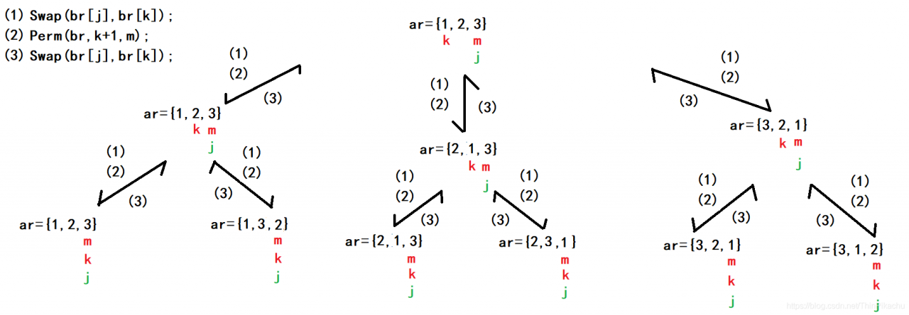 接着从 ar = {1,3,2} 这里开始执行(3),回到ar = {1,2,3}这里。此时 j == m,退出for循环,所以从 ar = {1,2,3} 这里继续执行(3),回退到第一个Perm函数中。