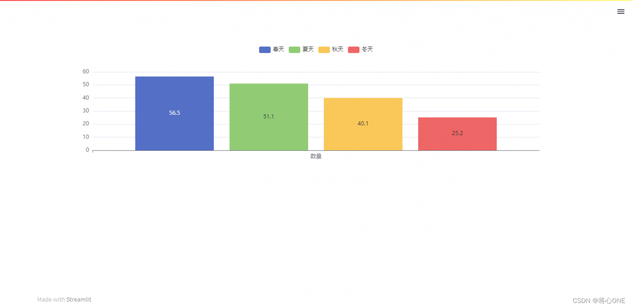 下面再记录下 柱状图 看了官方的demo不是很清楚 比如 我给的是列表集而文档是给的分开的字典 柱状的对应颜色如何更改 就比较烦心 所以我对streamlit公众号里的作者代码进行了精简 作者代码是饼状图柱状图合并的 我最后改变参数让他只显示 柱状图 当然 你也可以让他只显示饼状图 所以这段代码稍修改 就可以实现