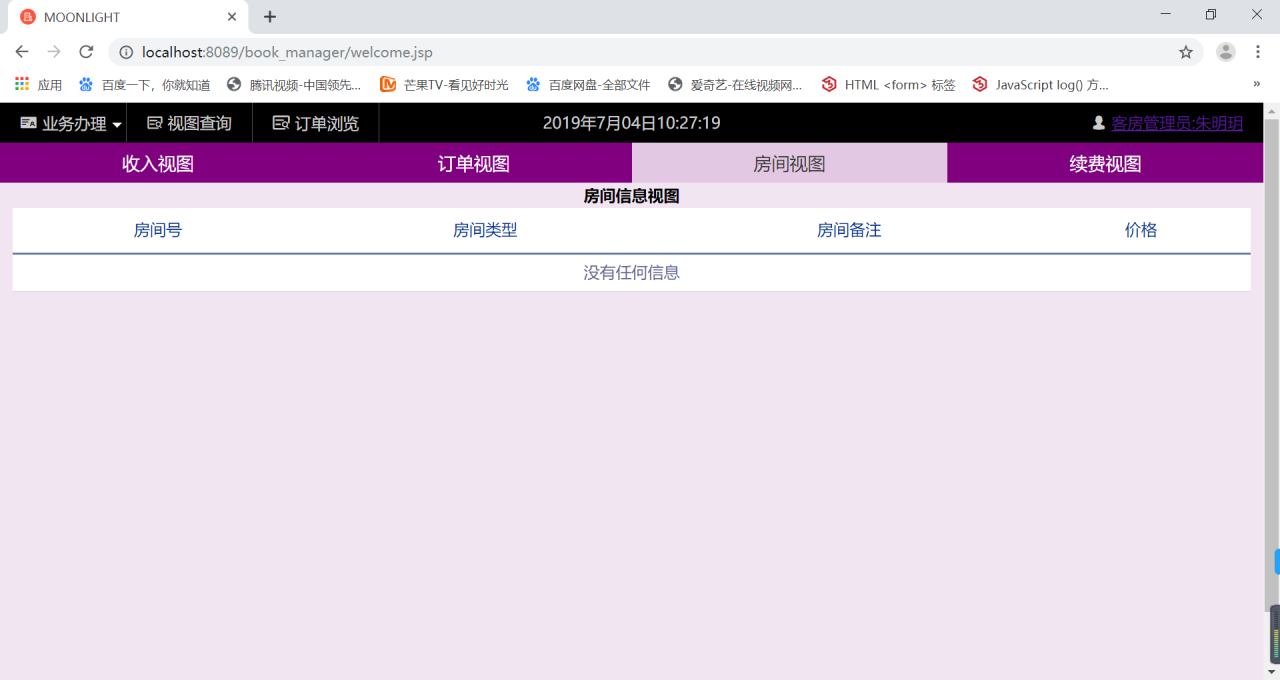 传统的酒店管理往往需要酒店管理人花大量时间和精力来处理顾客查询、顾客登记等事务,而错误的查询、繁琐的登记和结账手册、费用的结算错误、空余客房不能及时提供等等问题,可能导致顾客的频繁投诉,从而影响酒店的出租率。这些问题都可以通过计算机辅助系统来解决。随着计算机和信息技术的飞速发展,酒店客房的管理由传统的工作模式逐渐被信息化、网络化的现代工作模式所代替。以住宿为主的酒店假如再延用传统的管理模式,就会增加酒店管理成本和降低工作效率。在酒店客房管理中融入先进的计算机和软件技术,利用酒店客房管理系统进行管理就显得十分有意义。利用酒店客房管理系统进行管理能让管理者及时了解酒店整体情况,便于各种决策,同时也简化了管理的各种复杂操作,提高了酒店的管理效率。本文采用Javaweb,创建一个适合实际情况的酒店客房管理系统。