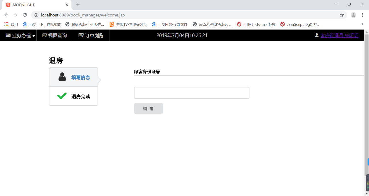 管理 人员 已经 登录 | 1.进入酒店管理页面 2.进行输入身份证号码入住 | 显示入住成功的信息 | 显示该身份证号定的房间是已入住状态 | 通过 |