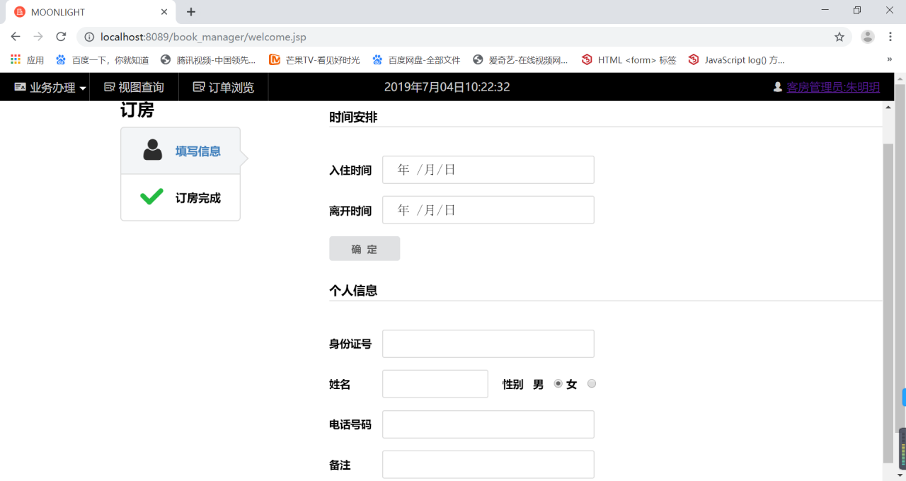 (3)预定管理模块主要是对住宿登记、住房时间、房间类型和住户信息。