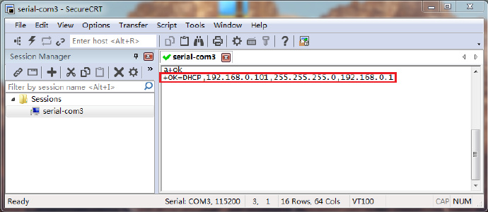 2)客户端电脑通过SecureCRT软件连接T2模块,发指令AT+WANN