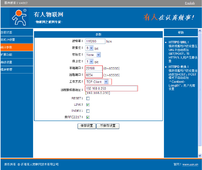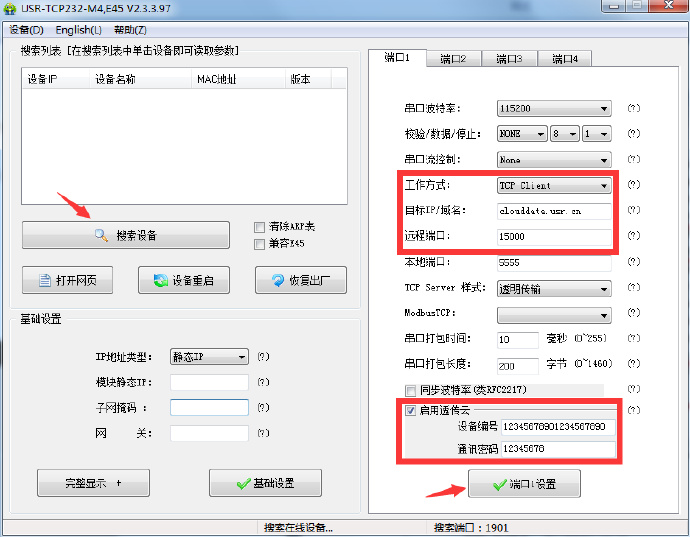 1)客户端电脑通过有人的“[设置软件]USR-M0_V2.2.1.272”按下图设置