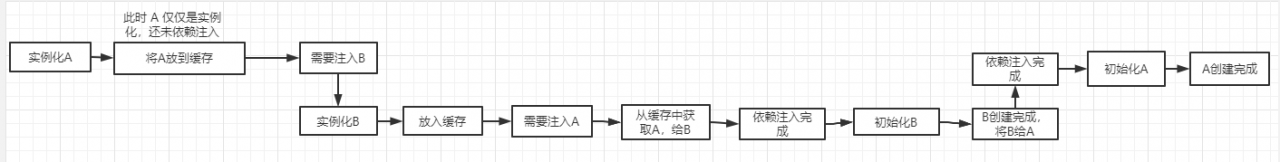 Spring创建的过程简单的可以简单概括为 实例化——>依赖注入——>初始化。而Spring解决循环依赖的方法就是在实例化之后,依赖注入之前,将实例化的对象放到缓存中进行提前曝光,后边的对象则在实例化前,先到缓存中查找有无对应的实例化对象即可,例如: