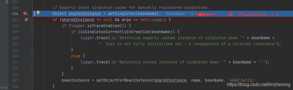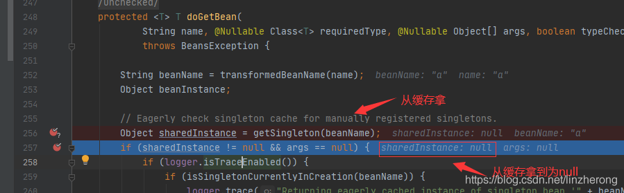 2.启动Spring容器,在创建A 的过程中会先来到 AbstractBeanFactory.doCreateBean 方法中找缓存(当然第一次找,肯定没有找不到,所以 sharedInstance = null)