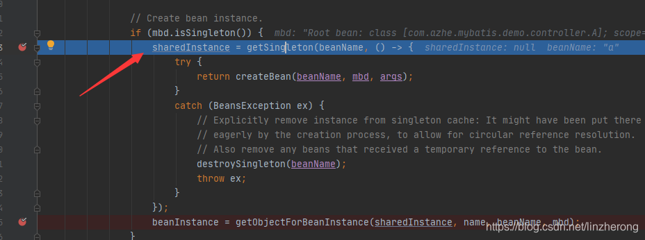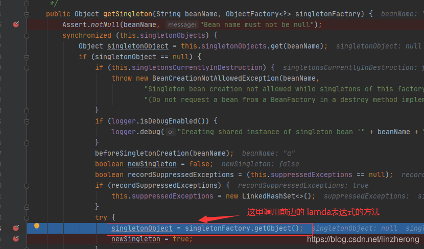 4.到了 DefaultSingletonBeanRegistry.getSingleton 方法,走到标记部分,这里就是调用了传入的 lamda 表达式的方法,进入这个方法)