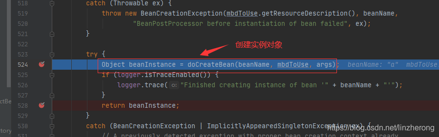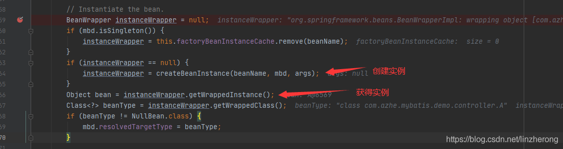 6.还是原来的类,来到了doCreateBean 方法,这里先创建并获得实例对象