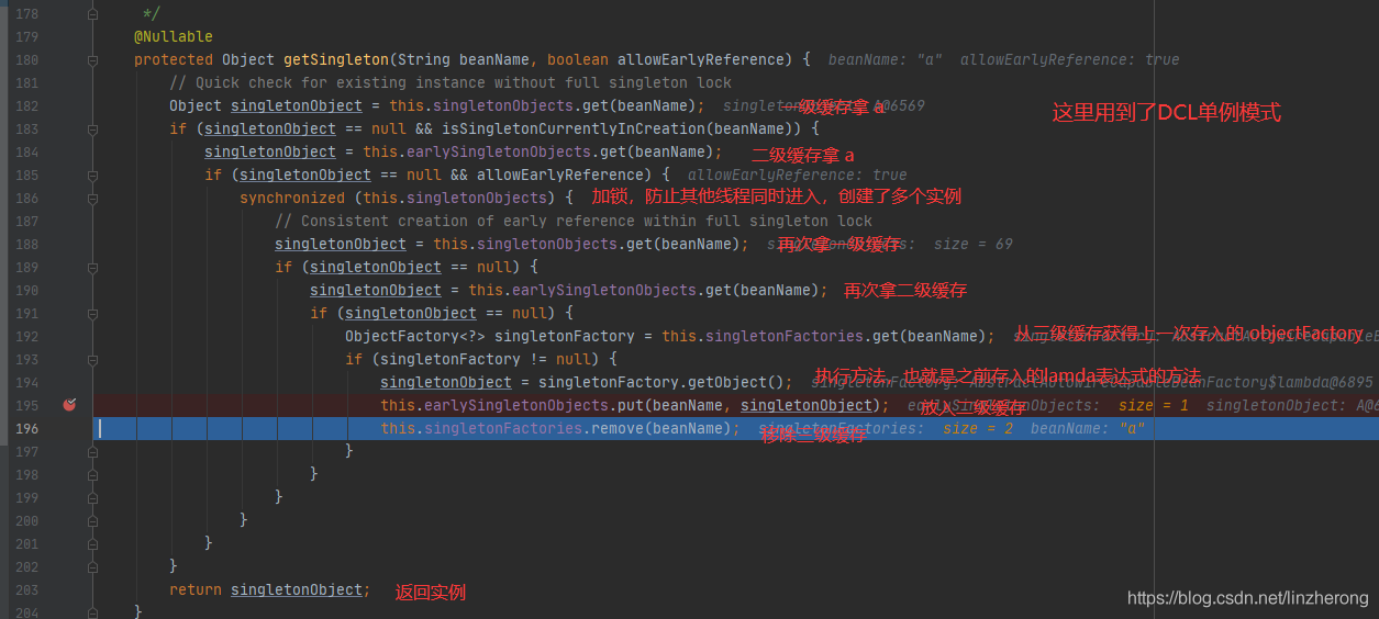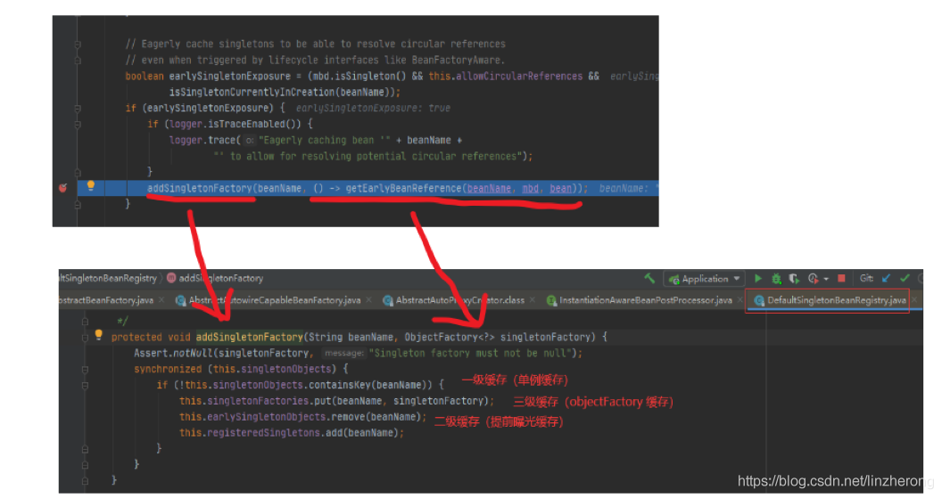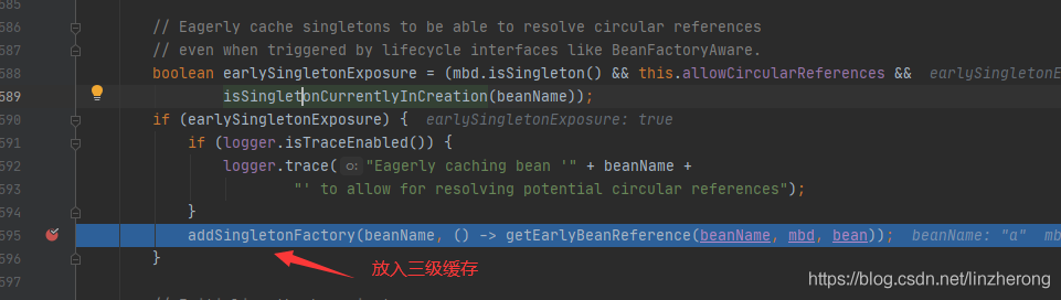 8.具体如下标识,首先判断一级缓存有无对应实例(此时没有),接着将传入的 () -> getEarlyBeanReference(beanName, mbd, bean)放到三级缓存 singletonFactories 中,这时候三级缓存就有对象了,此时的对象只是一个 带有方法
