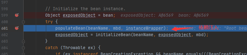 9.放入三级缓存后,回到doCreateBean方法继续走,走到这里开始进行依赖注入