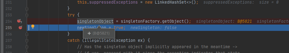 10.这里边后就需要对属性b进行注入,所以继续走前边一开始创建A的步骤一样去创建对象B,也是走到依赖注入这里,这时候要对B的属性A进行注入,所以又来到创建A的阶段 AbstractBeanFactory.doCreateBean,不过这次的 三级缓存 singletonFactories 已经有上一次放入的objectFactory了