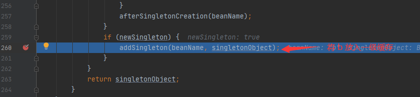 12.所以接着就继续走下去,b能拿到对象a进行依赖注入,继续走完 AbstractAutowireCapableBeanFactory.createBean 方法(第5步),返回对象回到 DefaultSingletonBeanRegistry.getSingleton方法中(第4步),此时b的值已经有了,