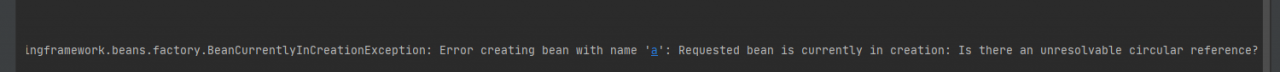 }这时候会报异常,因为这时候在实例化A的时候就需要b了(仅提供一个有参构造方法,所以Spring只能调用这个有参构造方法进行实例化),而这时候去创建B,发现B也需要a,而a又还没实例化,所以没法实例化了