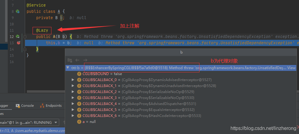 此时代表构造方法中的B是延时加载,所以构造的时候Spring先帮我们创建了B的代理对象,这时候A就可以实例化成功,此时再去实例化B,因为A已经实例化完成,那么B也可以实例化成功了。
