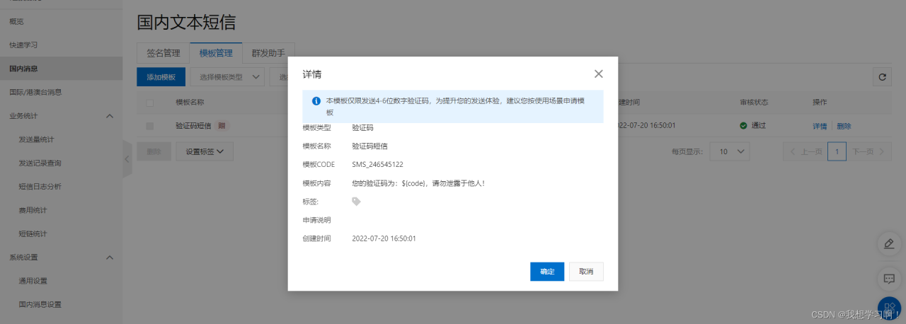 注册成功后,点击登录按钮进行登录。登录后进入短信服务管理页面,选择国内消息菜单: