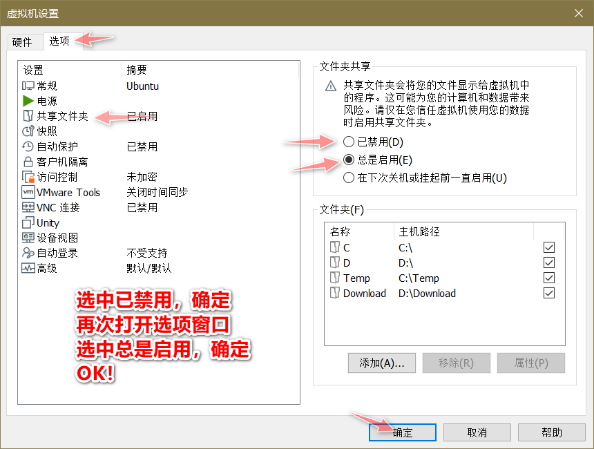 - VMware菜单【虚拟机】→【设置】→【选项】→【共享文件夹】,