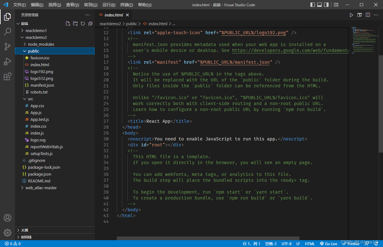 先前创建了一个reactdemo2的项目在public中我们可以看见一个index.html