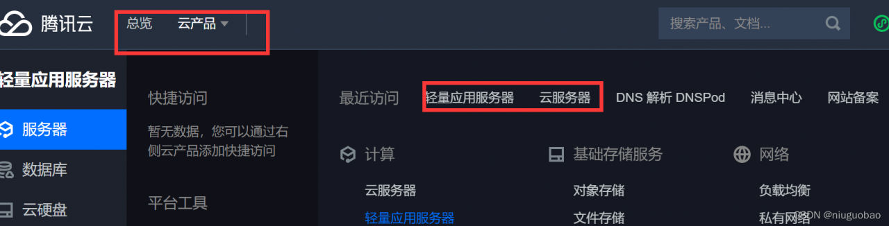 点击云产品,搜索轻量应用服务器(如果你买的是云服务器就点击云服务器)