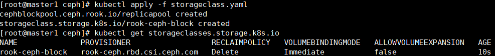详解:如下配置文件中会创建一个名为replicapool的存储池,和rook-ceph-block的storageClass。