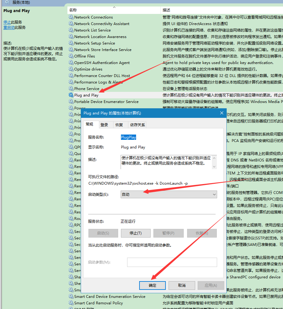 然后再点击 Plug and Play服务 设置重新启动,将Plug and Play服务的启动类型为:手动或自动,启动服务,点击应用,确定,此时启动类型为:手动或自动,服务状态为:正在运行;