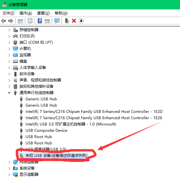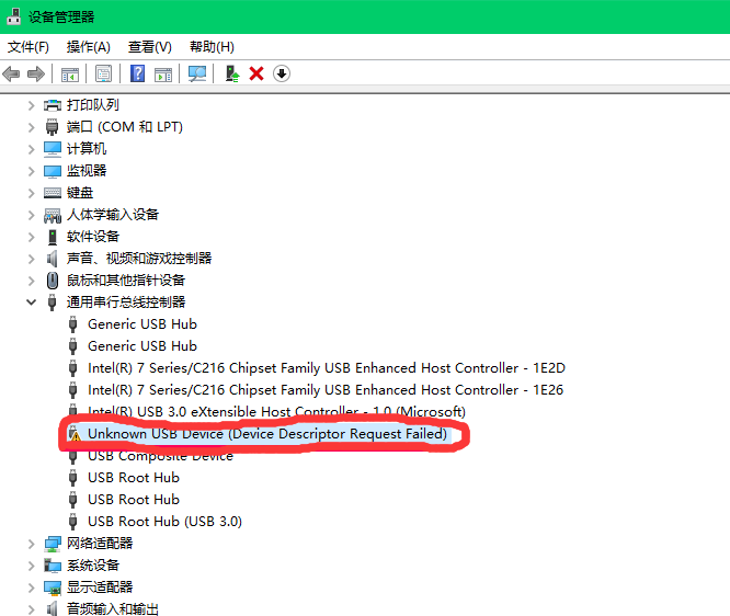 问题:进入设备管理器,发现【通用串行总线控制器】下有一项带有黄色【!】未知USB设备(设备描述符请求失败)。