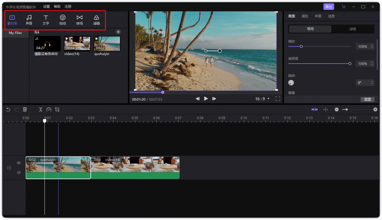 牛学长视频剪辑软件,特别是对新手党、初学者来说很友好,不需要任何剪辑知识也能很快的上手,像视频加字幕、分割合并、视频画中画、视频添加BMG等这类基本的操作基本3分钟就能搞定,比一般的视频剪辑软件入手门槛更低,另外还自带上千种特效、滤镜、转场、音频、字幕等各种素材库,点击就能使用。