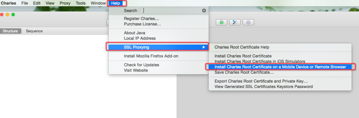 点击 Help -> SSL Proxying -> Install Charles Root Certificate on a Mobile Device