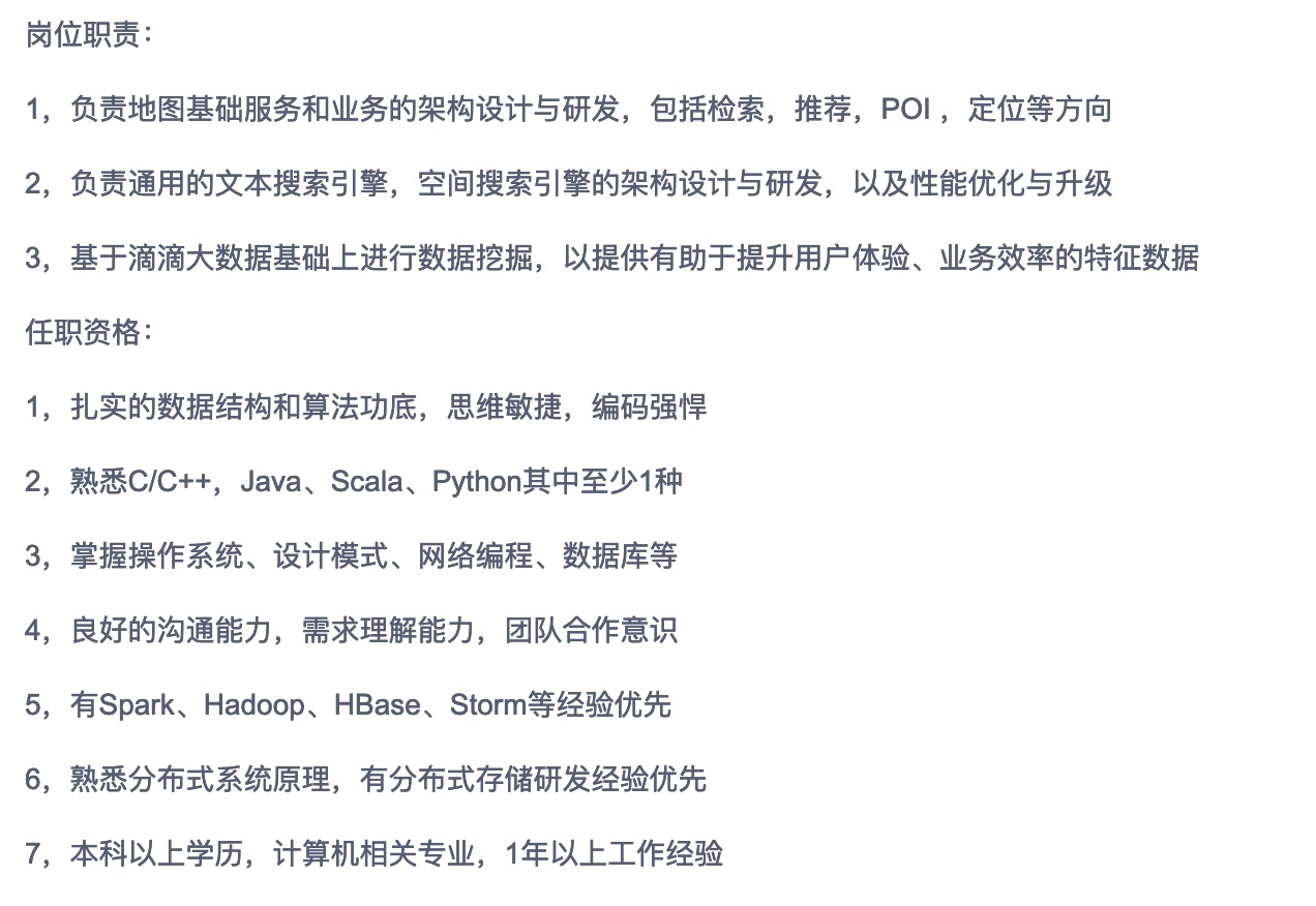 了解了什么是大数据,接下来介绍一下大数据开发这一岗位,先直接上岗位描述(JD:Job Description)给大家感受一下。然后来说明一下大数据开发工程师的主要工作,最后再来总结一下需要掌握的技能。