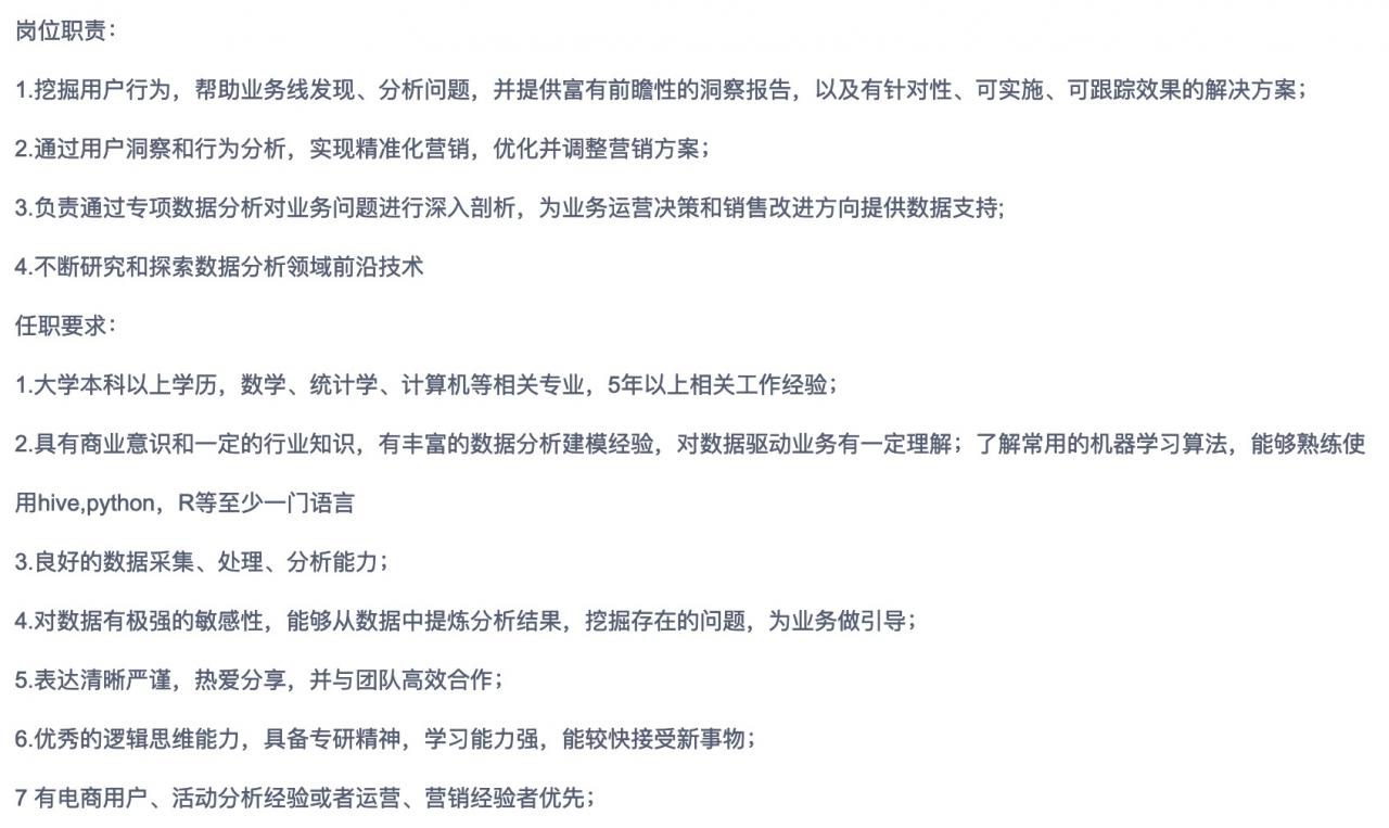 说到数据分析师,这不是本文的重点,因为门槛相对较高,另一方面更偏数学、统计学方向,更多的是与数据、算法打交道,编程的产物通常不是应用,而是一个算法模型。我们还是先来看一看相关的JD: