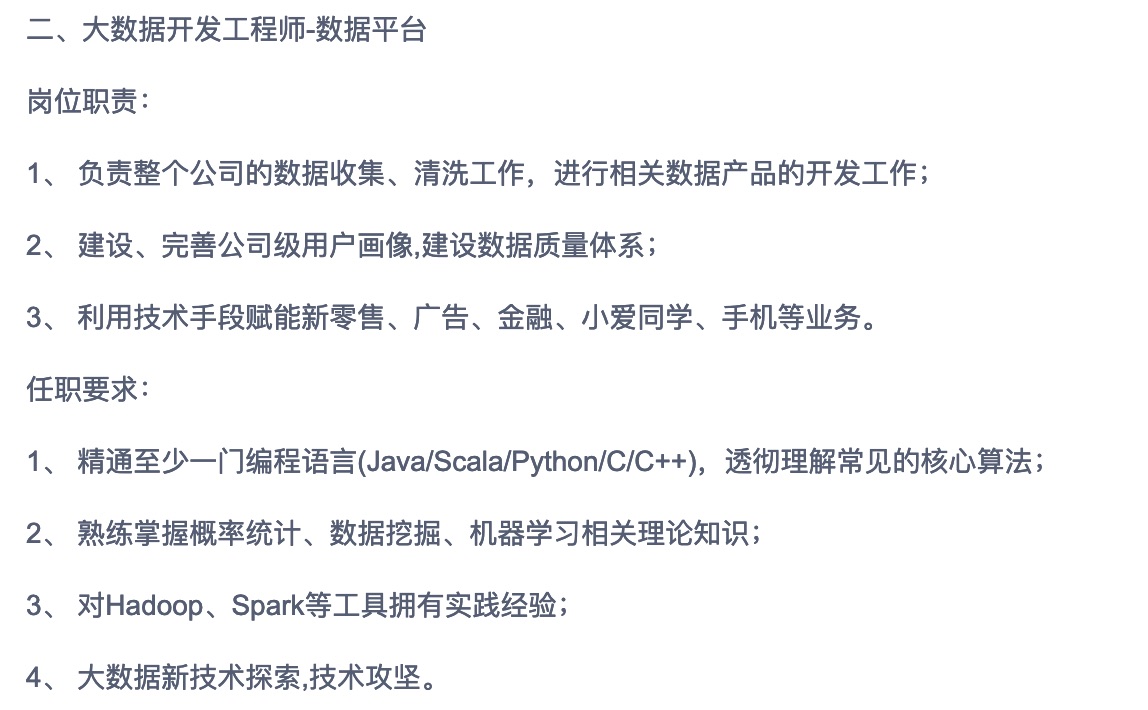 从上面的岗位描述中我们可以发现大数据开发工程师一般会与业务进行对接,要么是基于某一个场景进行有针对性的数据处理,要么是打造一个大数据产品。在这里我们也需要纠正一个小小的概念,可能有些小伙伴认为有大数据岗位需求的公司一定是一个自身具备大量数据、有着大量用户积淀的公司,其实不然。除了分析公司自身业务数据以外,同样可以打造一款通用的大数据产品,所以大数据的岗位虽然不像普通的开发工程师那么多,但是需求依然存在。