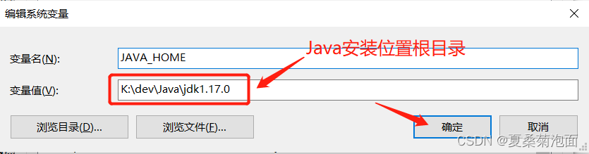 2.“环境变量”界面中系统变量点击”新建“,创建JAVA_HOME=K:\dev\Java\jdk1.17.0(JDK的根目录)