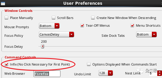 从CIW窗口中选择“Options”->“User Preferences”->“Infix(No Click Necessary for First Point)”