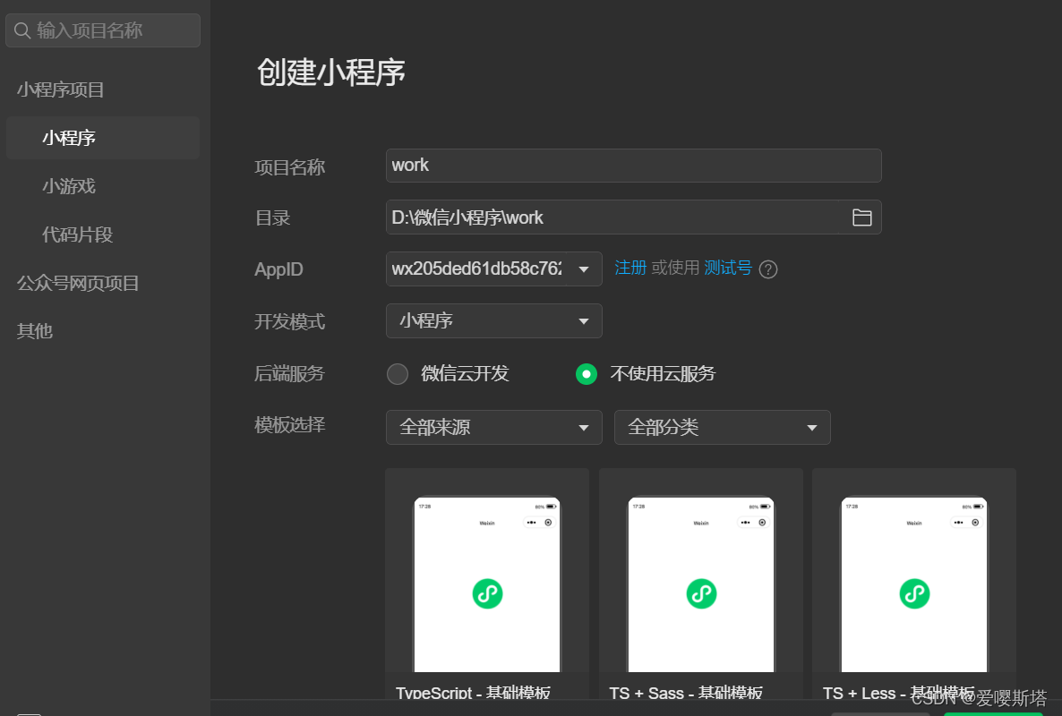 创建小程序,此处模板选择JavaScript: