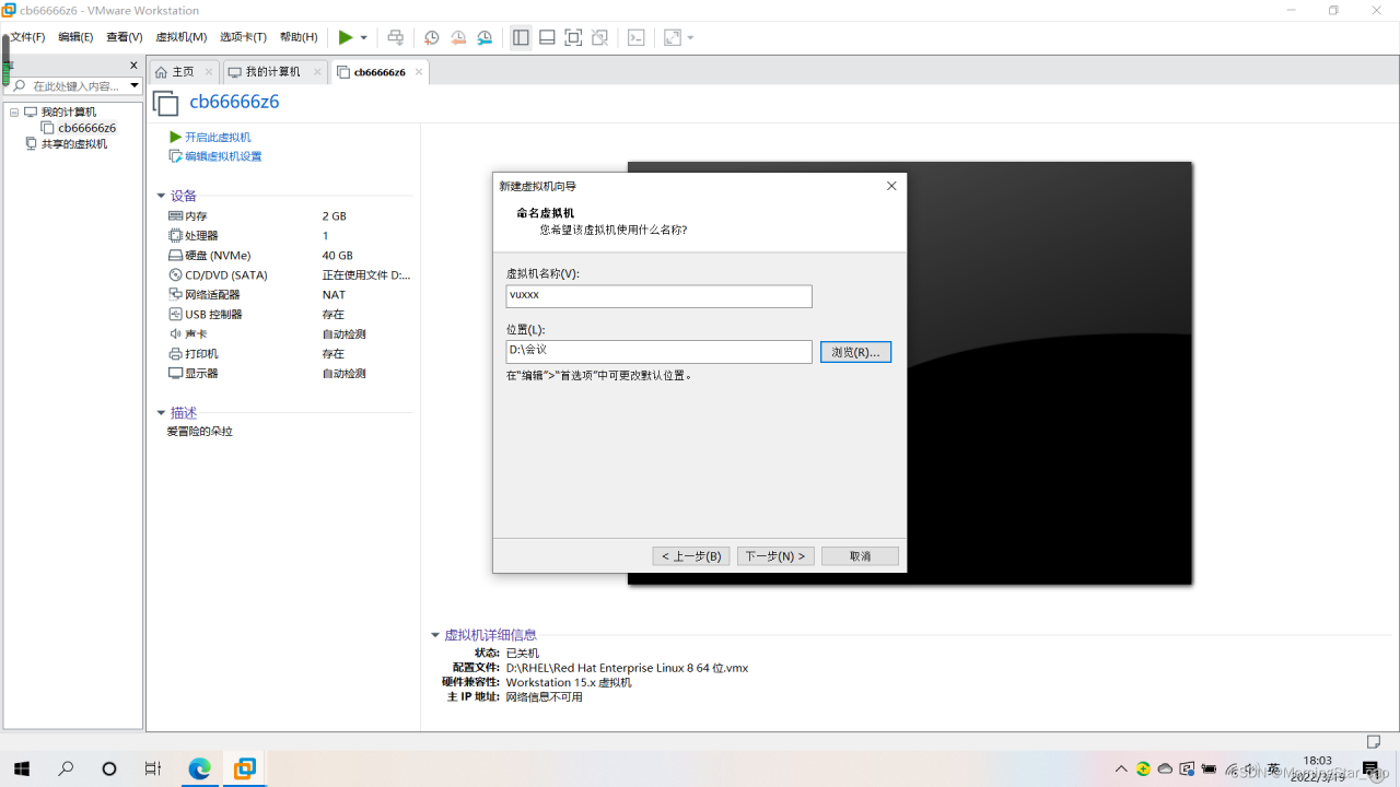 5.设置虚拟机名称以及安装位置。点、击下一步。(建议D盘安装)