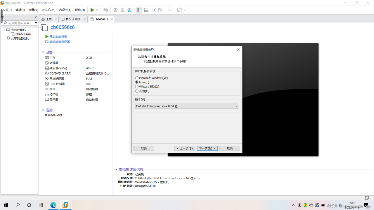 4.选择Linux操作系统,选择RED HAT Enterpirse Linux 8 64位 点击下一步。
