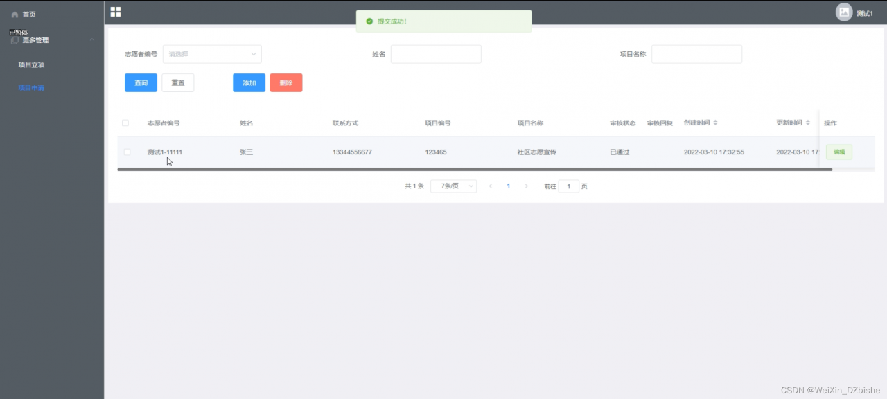 项目申请页面可以搜索志愿者编号、项目、联系方式、项目编号、项目名称等详情信息等操作。